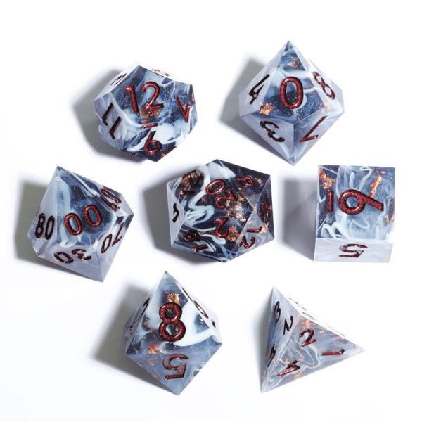 Complete set of seven sharp-edged polyhedral dice, hand poured, polished and sanded to extraordinary fineness.Hand-made, hand-sanded, hand-polished sharp-edged dice.Seven polyhedral dice.Hand-made and hand-engraved. Recommended for use in dice trays.